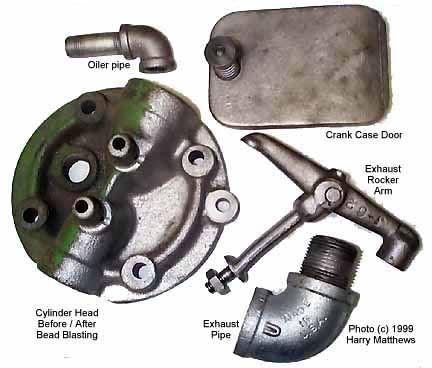 Click the photos of the restoration and then close each photo before continuing. I never seem to get the FULL before photo because I'm in a hurry to take it apart I guess. Bead blasting sure makes painting easier. Click this LINK to visit my old engine bead and sand blasting page. A few photos follow to show the results of bead blasting: the cylinder and head. More bead blasted parts and the underside of the head.