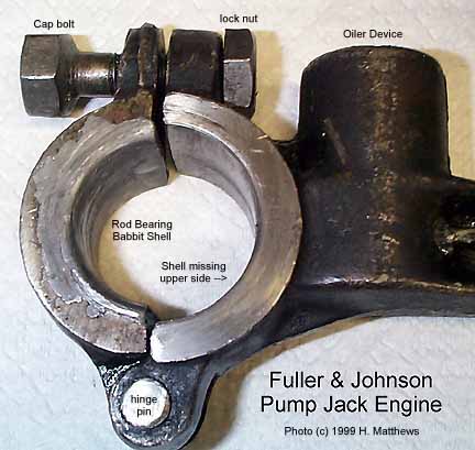 To my surprise, the top half of the babbit shell was MISSING! Never buy an engine that isn't running unless you like surprises. Ed at HitnMiss Enterprises made a replacement for me. The rod has a built in grease cup with tubing to the wrist pin and a port to the crank pin. I'd be curious to know if anyone else has run into one of these. The ONLY lubricant to the wrist pin is via this cup and pipe because the piston has NO oil ring holes. The crank pin is fed grease from a cup at the rear end of the crank shaft too and some of this will work its way up the tubing.