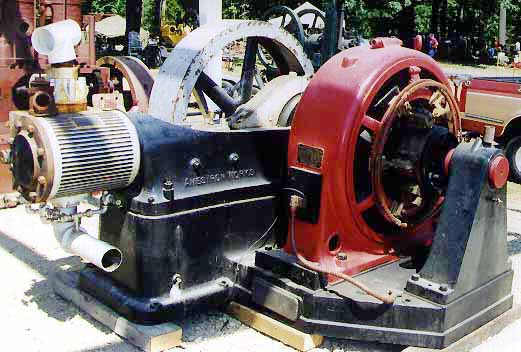 These Ames Iron Works products caught my eye because they are from Oswego, NY where I lived and worked for 23 years. The factory buildings stood vacant for decades with no sign of the magnificent old steam engines that they once created. Here, at the opposite end of the country, we can see their heritage. The unit on the left is a direct coupled steam engine/generator for 110 volts DC. The unit on the right (shown here for continuity) ran a mine at Idaho City, ID. Visit the GALLERY for engravings of this and other engines! |
