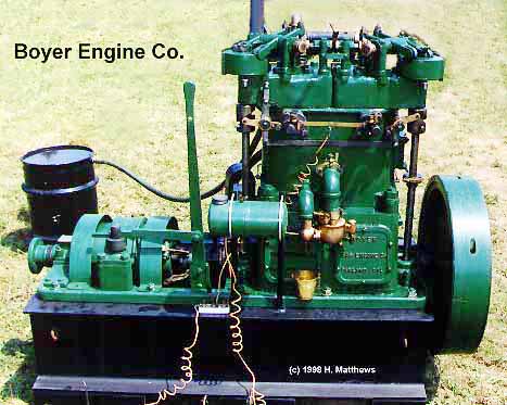 | This BOYER 10HP two cylinder marine engine is from Oakland, CA around 1926. It has overhead cams with twin vertical side shafts and is fired by igniters. Many hours went into this restoration. |